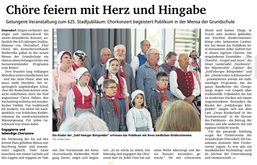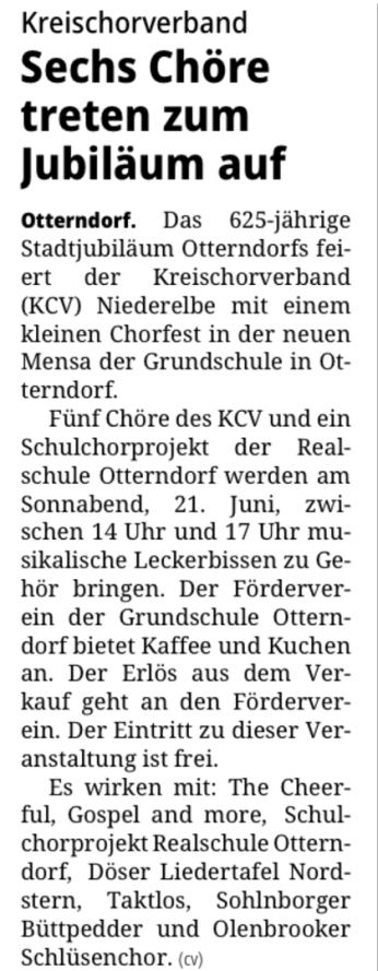 In der Niederelbe Zeitung vom 27.09.2013 war unter dem Titel "Der Honig ist das Beste für die Stimme" ein Porträt der künftigen Chorleiterin Birgit Huse zu finden. Einen Monat später wuirde sie unsere Chorleiterin.
